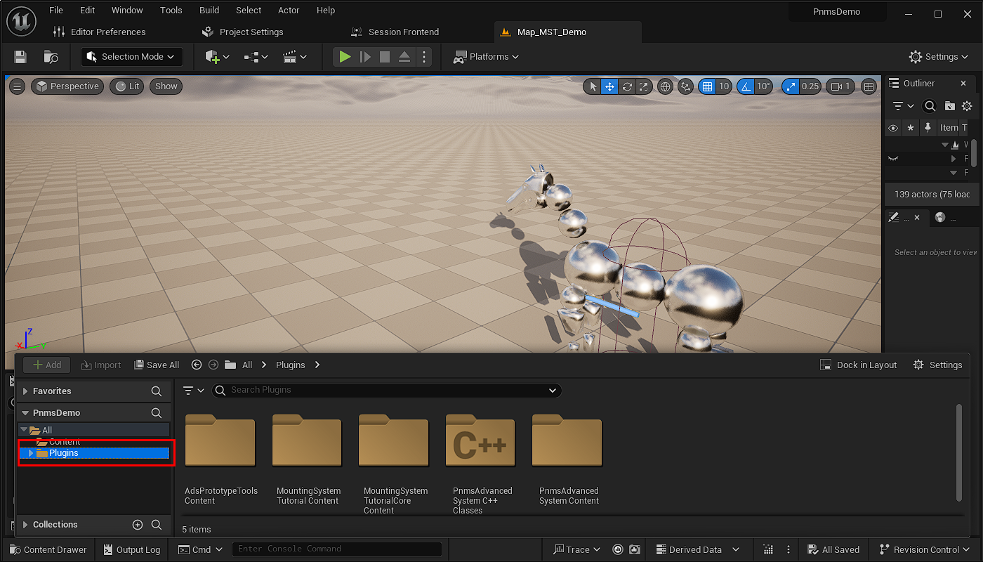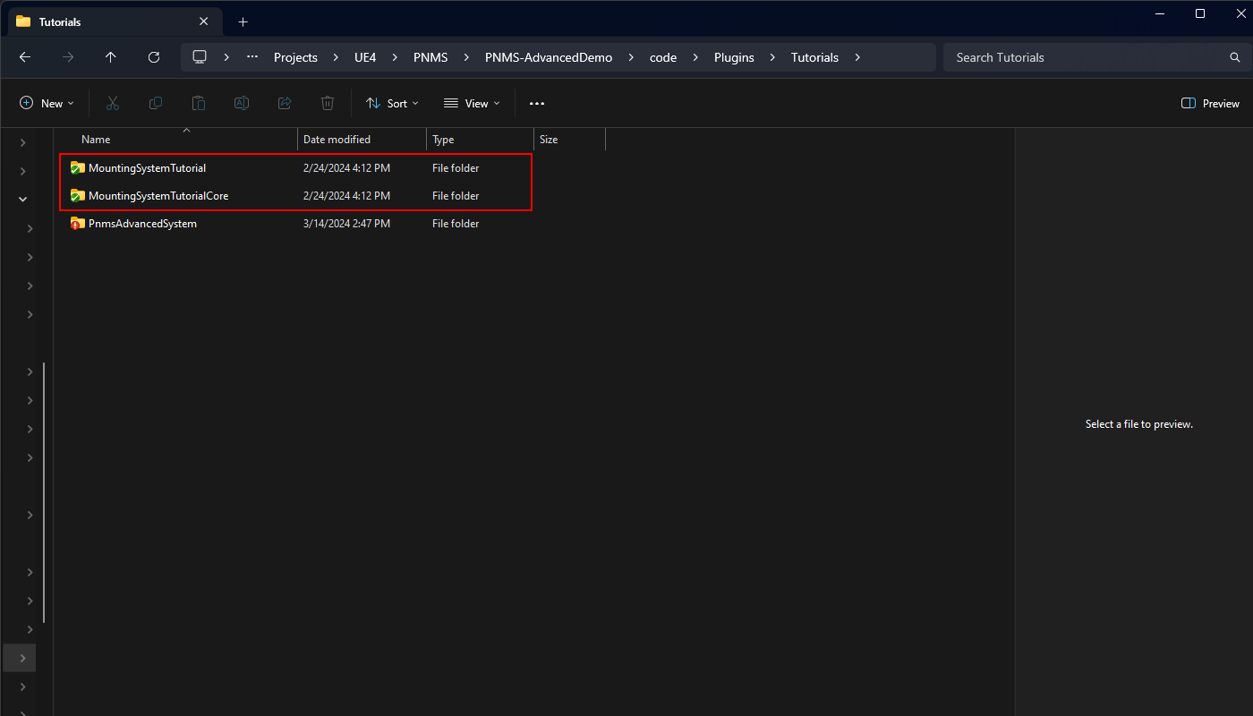 Next go to the Demo Project and find the folder Plugins/Tutorials and copy both the MountingSystemTutorialCore plugin and the MountingSystemTutorial plugin. Copy both of these plugins into your projects Plugins Folder. Feel free to create any subfolders you need. These two plugins form the Full Demo of the PNM System fully implemented in Blueprints.